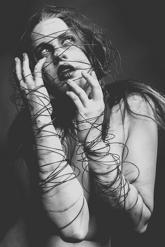Then we moved onto a darker themed set using just some wire that he found at the flea market. I made my hair crazy, and darkened my makeup, and used the oil that was on the wire the make the photos look grimy and dark.