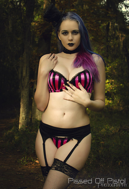 October is here! For October I donned a semi-theatrical ensemble out in the woods and finished it with a tiny top hat and cane. I love my outfit, and it was perfect for the pink and black striped lingerie that I paired it with.