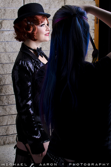 She needed promo shots for her burlesque acts (she performs with The Manic Menagerie in Gainesville, Florida), so we started with a set called “Puttin’ On The Ritz” with an adorable sequined bow-tie and hat, and I had a cane in my car, so we completed the look!